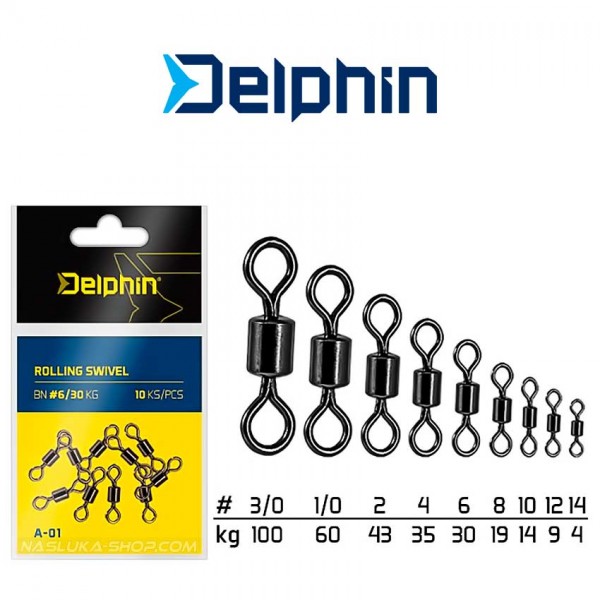Delphin Rolling Swivel са с цвят черен никел, в опаковка по 10 броя (7 броя за размер 3/0).