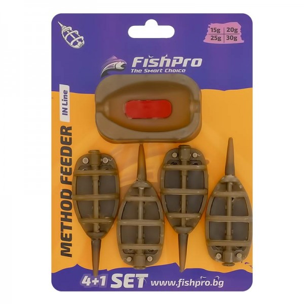 FishPro Inline Method Basic 4+1 е пълен комплект за метод фидер риболов. Включва четири оборудвани инлайн метод фидер хранилки и преса с подходяща форма.