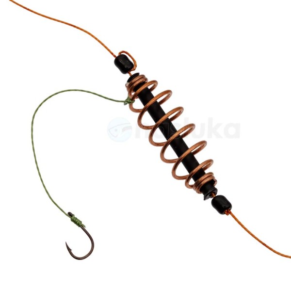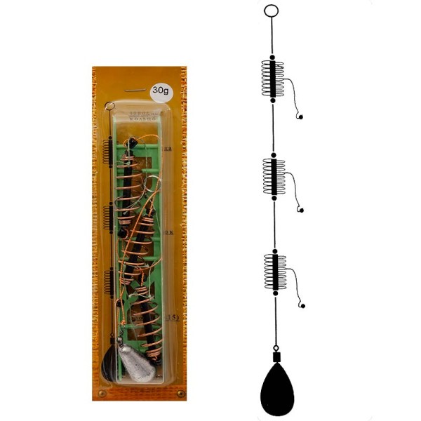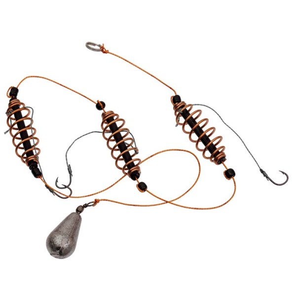 Комплектът включва три хранилки тип спирала, тежест с вирбел против усукване и три остри, здрави куки (№4) с монтирани поводи. Изработена така, че да държи всеки повод встрани от основната линия, като така се избягват нежелани заплитания и се повишава успеваемостта.