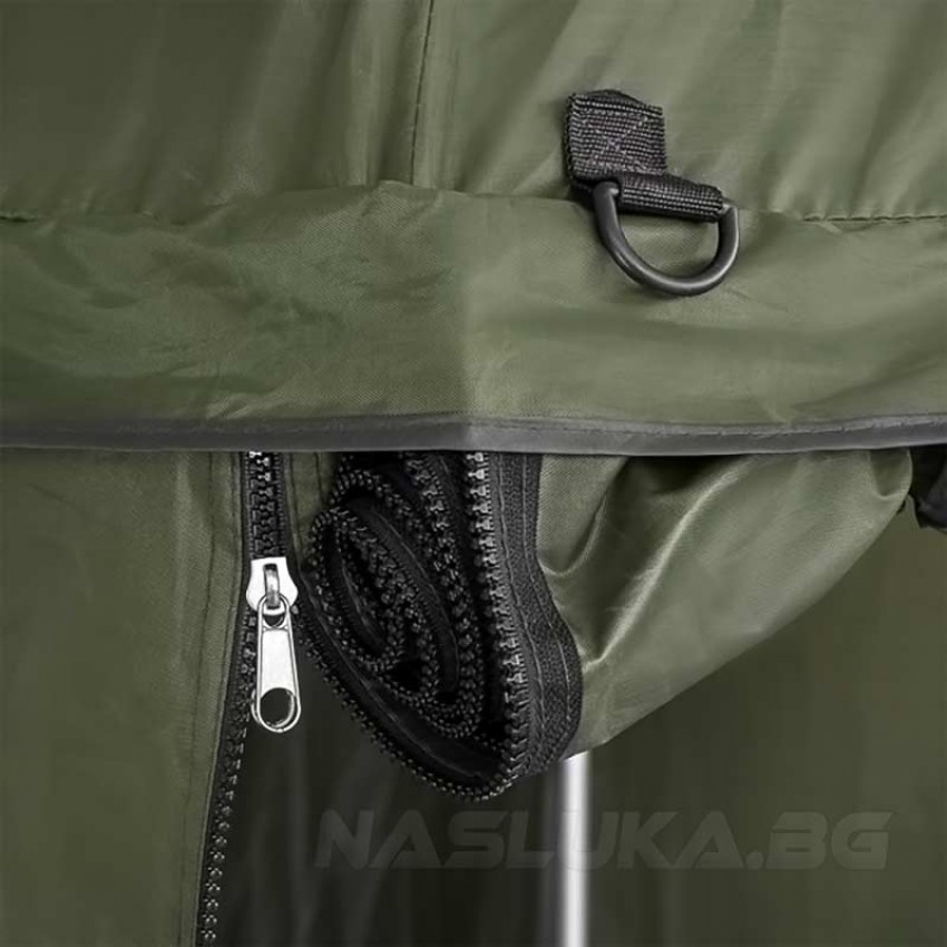 Чадърът има врата с висококачествени ципове и прозрачен пластмасов прозорец, който ви позволява да виждате въдиците дори когато навън вали.