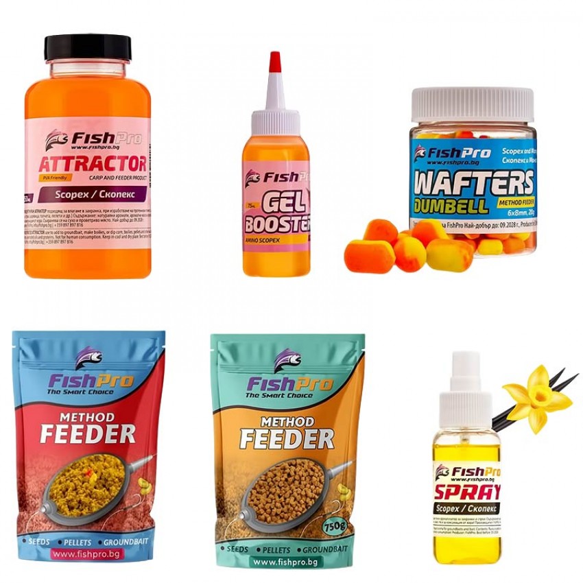 Комплектът Метод Мания Scopex включва мокра захранка, пелети за фидер, гел-атрактор, добавка-гел, ароматизиращ спрей и дъмбели.