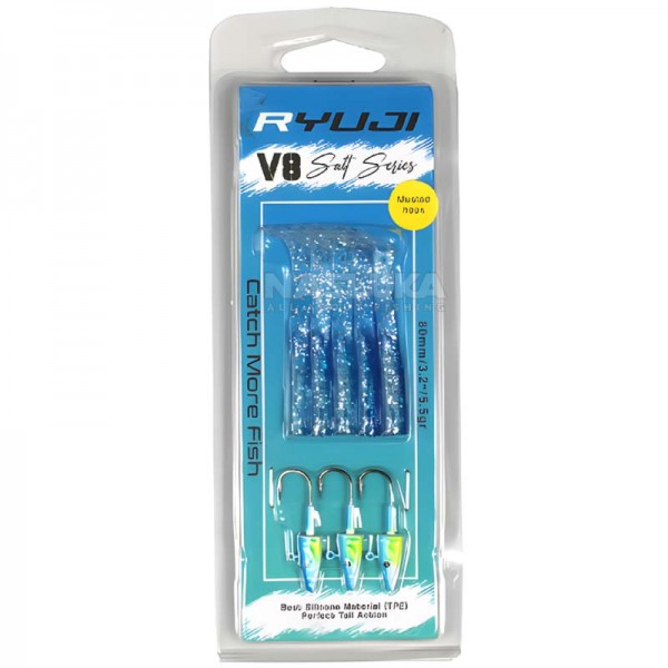 Ryuji V8 Salt Series е комплект силиконови примамки с джиг глави, предназначени за соленоводен риболов.