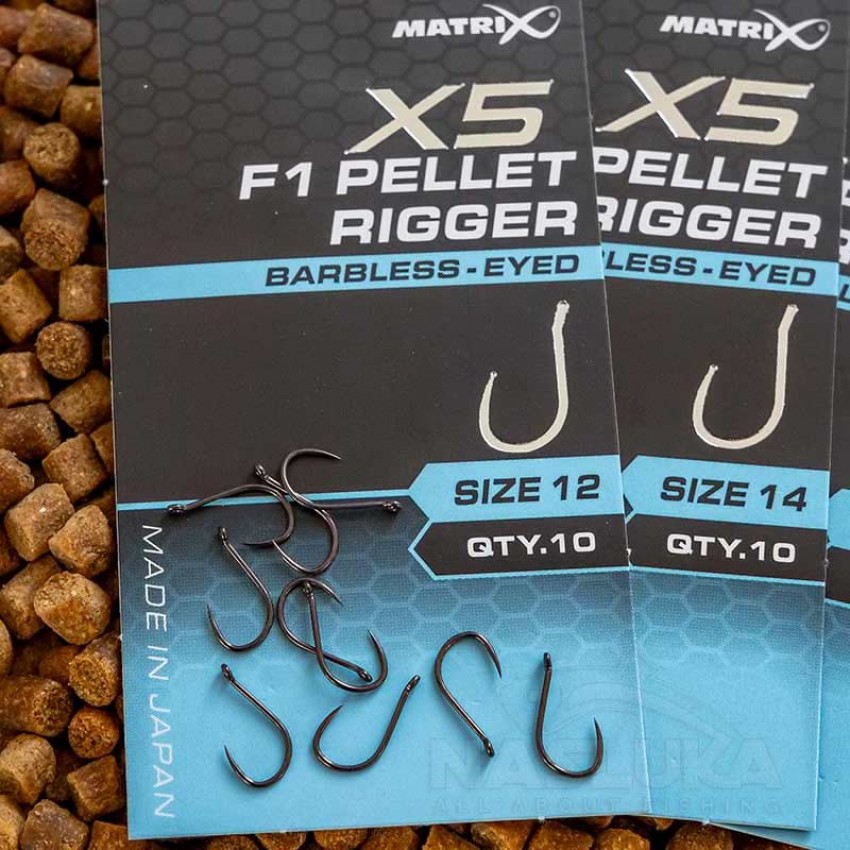 Куките Matrix X5 F1 Pellet Rigger са създадени с една-единствена цел – максимална ефективност при риболов на F1, шаран и каракуда с пелети или мека стръв, особено в условията на състезателен и интензивен комерсиален риболов. Това са куки с ухо и без контра, които съчетават прецизност, бързо проникване и сигурно задържане, дори при най-фините монтажи.